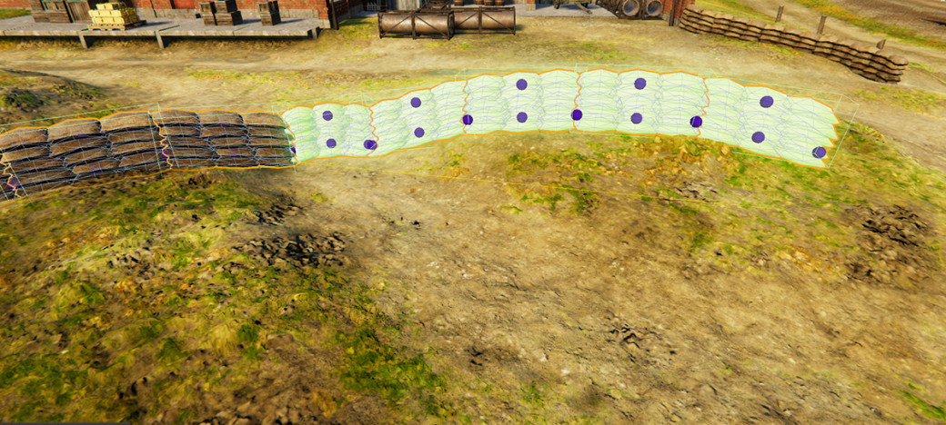 I am currently working on a tool for our level designers, that will allow them to place walls and other objects in the level in a fast and easy way that behaves in a very similar way to how building things like sandbag-barriers will work In-Game. For that I have experimented with new ways to change the shape of wall-segments to hopefully look good, while adjusting its shape to the terrain.