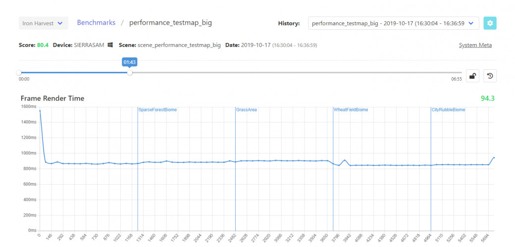 I am currently working on documenting and improving our business tools. As our asset production pipeline is now operating at full speed, we need to make sure that our process management tools can keep up. Another tool, that has been in a prototype phase for a couple of weeks, is now operational. As you can see in the screenshot, we use it to track and collect data from our benchmark test map and draw multiple visual graphs with it that we can view directly in the browser, even if the benchmark is still running!