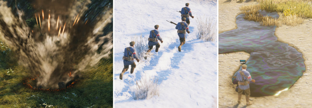 I‘ve made the environment more interactive: Vegetation now has a dynamic wind system with changing directions. Trees and grass react to explosion shock waves. Grass can be burned or trampled down. The terrain becomes beaten by craters, burned earth and oil spills. Units also leave trails in the snow.